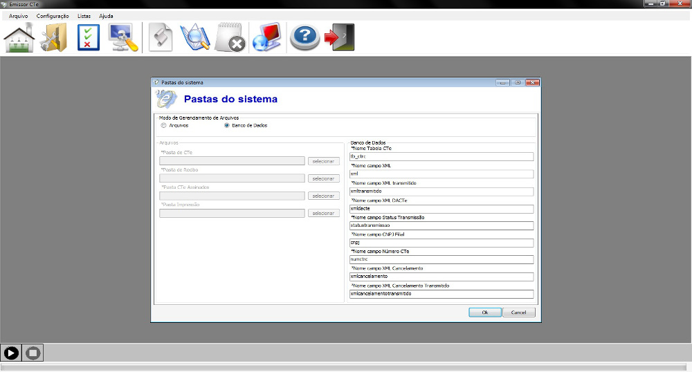 O sistema possui a leitura em um diretório de entrada, onde será copiado o arquivo XML do CT-e para validação e transmissão à receita federal, esse arquivo XML precisa seguir o padrão de schema fornecido pela receita federal. Essa leitura também pode ser feita via tabela de banco de dados, não sendo necessário nesse caso utilização de um diretório de arquivos.